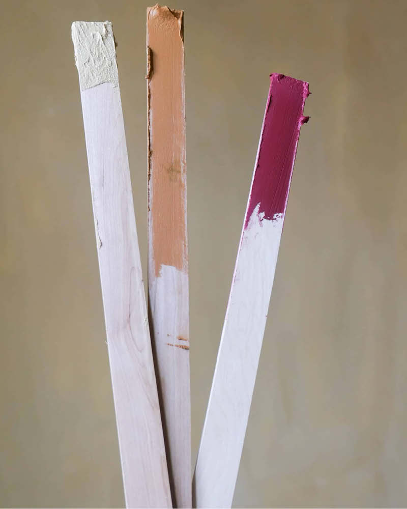 „Það er spennandi að vinna með litakort í brenndum og heitum litum, en oft er leyndarmálið að vinna með andstæða liti. Þá þarf kjark til að kanna hvort litir passa vel saman og færa þér góða upplifun,“ segir Elvheim. Hún kaus að nota litaða spartlið KC14 í Mustard, Warm Terracotta og Burgundy og finnst áferð vörunnar skila henni alveg glænýrri og skemmtilegri áferð miðað við venjulega málaða fleti.